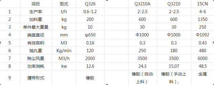 履帶式拋丸機分為Q326、 Q3210、Q3220、15GN等型號。其中Q326/Q3210為橡膠履帶式拋丸機,Q326端盤直徑為650mm,一次性額定處理200KG。Q3210端盤直徑為1000mm,一次性額定處理600KG。Q3210又可選擇自動上下料式。Q3220為2個拋頭定制型,15GN為自動上下料鋼履帶拋丸機。